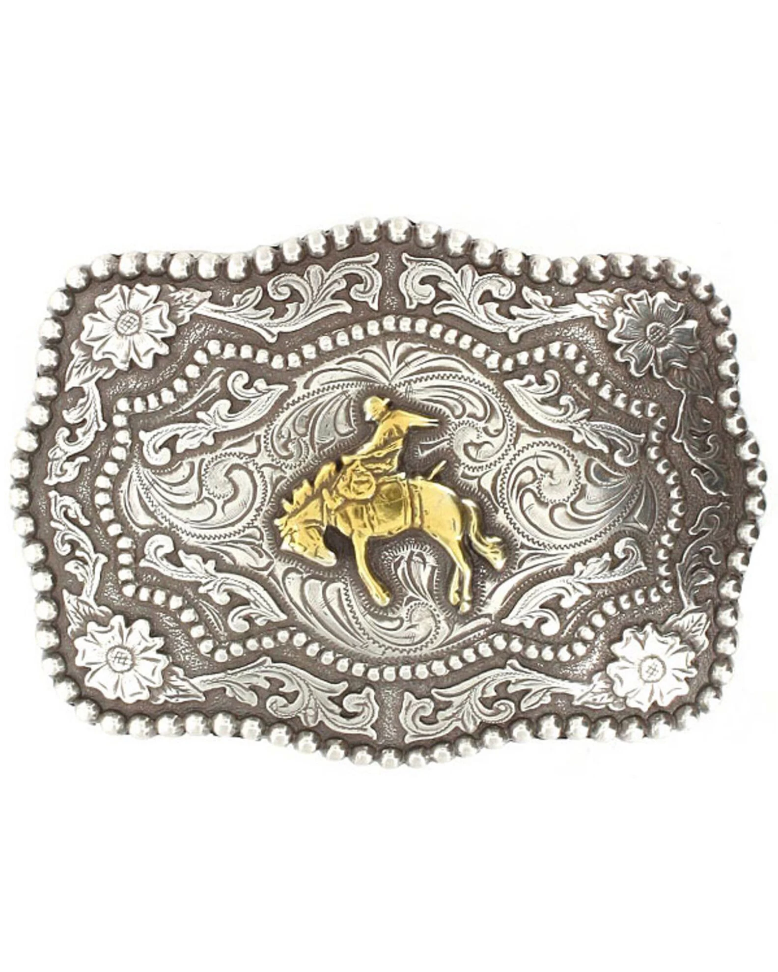 Cowboy-up with this Cody James Bronc Rider Belt Buckle. This rectangular buckle has beautiful western style filigree, silver dot border, and silver flowers. To complete this great look, Cody James has added an eye-catching bronze bronc rider figure to the center. Top off your favorite outfit with this bronc rider belt buckle and you will be ready to hit the town in style.