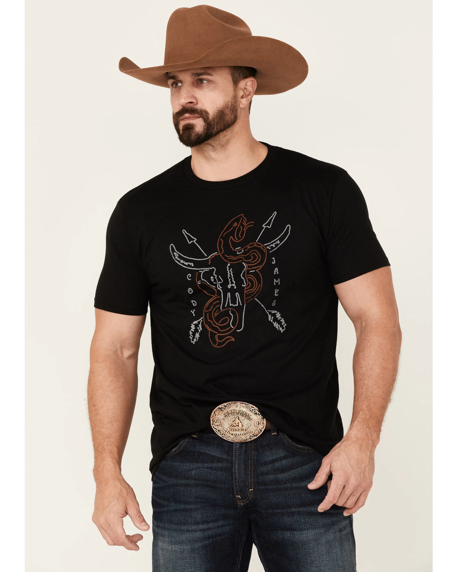 - “Cody James” with cross arrows, steerhead skull, and wrapped around snake graphic on front